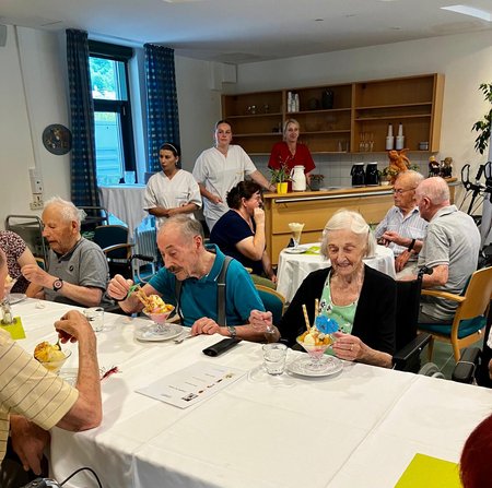 Die Bewohnerinnen und Bewohner des Seniorenwohnhauses Elsbethen durften sich Mitte Juli über eine kühle Erfrischung freuen. Die Auswahl an Eiskreationen reichte von einem Eiskaffee über einen Früchtebecher und einem Eierlikörbecher bis hin zu einer Heißen Liebe und einem gemischten Eis. Damit war für jeden Geschmack etwas Passendes dabei. Die liebevoll zubereiteten Eisbecher wurden in gemeinsamer Runde genossen.