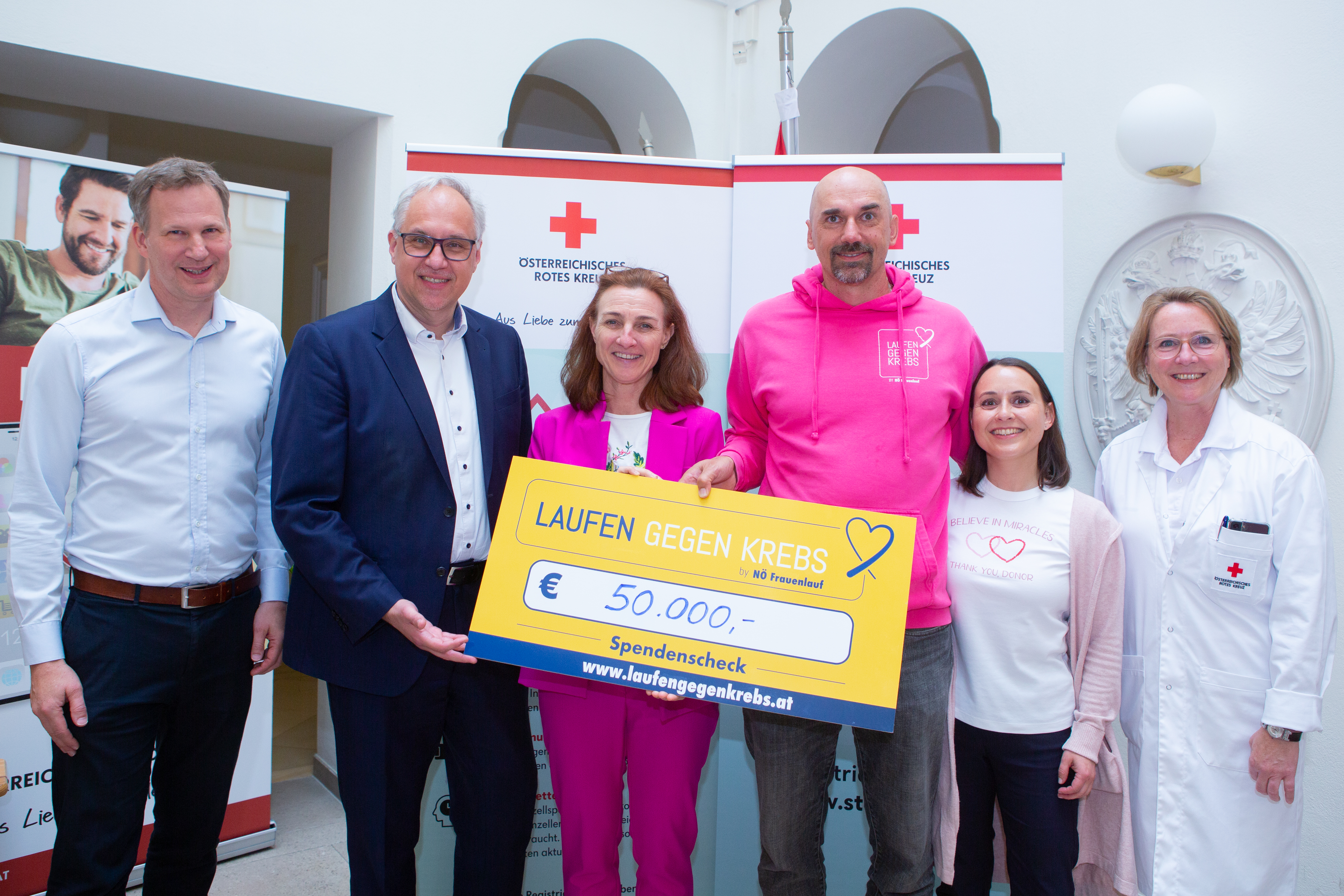 „Laufen gegen Krebs“- Initiatoren überreichen Scheck in Höhe von 50.000 Euro an Rotes Kreuz. Niederösterreicherin wird durch Teilnahme am Lauf zur Spenderin.