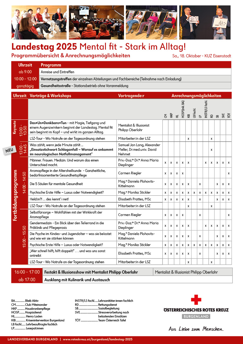Freu dich auf ein abwechslungsreiches Fortbildungsprogramm, Vernetzungstreffen & Austausch mit Kolleg:innen, inspirierende Begegnungen, feines Essen, eine interaktive Gesundheitsstraße – und als krönenden Abschluss: die außergewöhnliche Illusionsshow von Philipp Oberlohr. Ein Tag voller Impulse, Austausch und Staunen – für dich und deine mentale Stärke im Alltag!