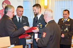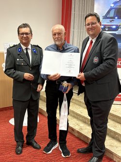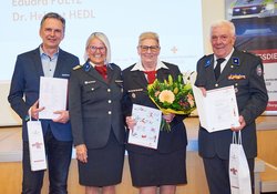 Bezirksfeuerwehrkommandant Martin Reidl, Andreas Schmidt und Kurt Kappel bedankten sich beim Dienstführenden Franz Lang und seinem Stellvertreter Thomas Schedl, die auf Bitte der Feuerwehr rasch und unkompliziert den Heimtransport eines im Ausland verunfallten Feuerwehrmitglieds organisiert und durchgeführt hatten. Sie erhielten dafür das Verdienstzeichen in Bronze des Burgenländischen Landesfeuerwehrverbands überreicht. Rotes Kreuz und Feuerwehren arbeiten zusammen und helfen einander.