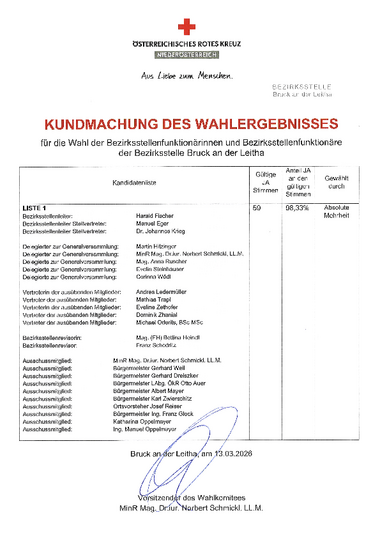 Im Rahmen der Wahl am 13. März 2026 in der Bezirksstelle Bruck/Leitha wurde Harald Fischer mit großer Zustimmung zum Bezirksstellenleiter gewählt. Gemeinsam mit seinen beiden Stellvertretern Manuel Eger und Dr. Johannes Krieg erhielt er 98,3 % der abgegebenen Stimmen.