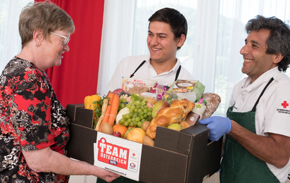 Mitarbeiter der Team Österreich Tafel überreichen einer Kundin einen Karton voller Lebensmittel.
