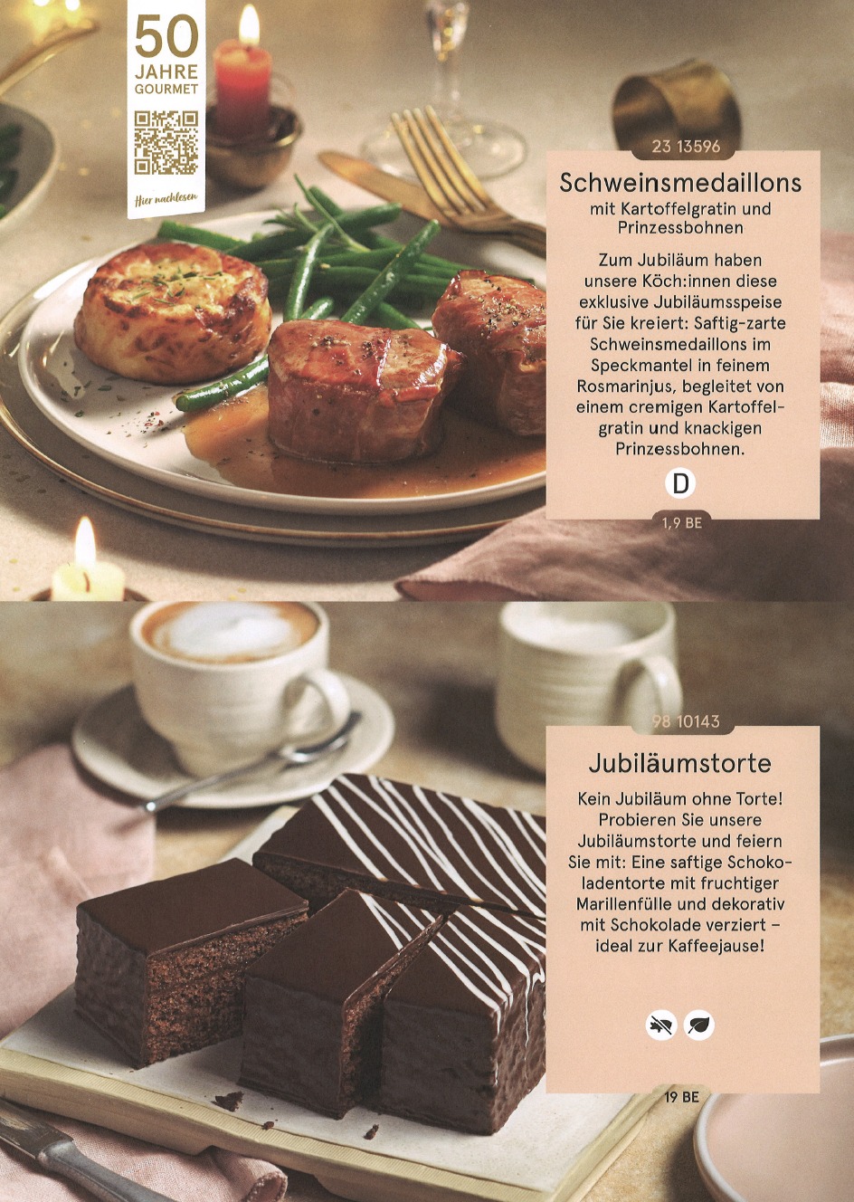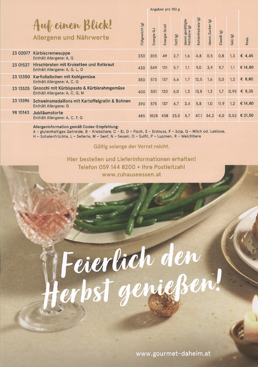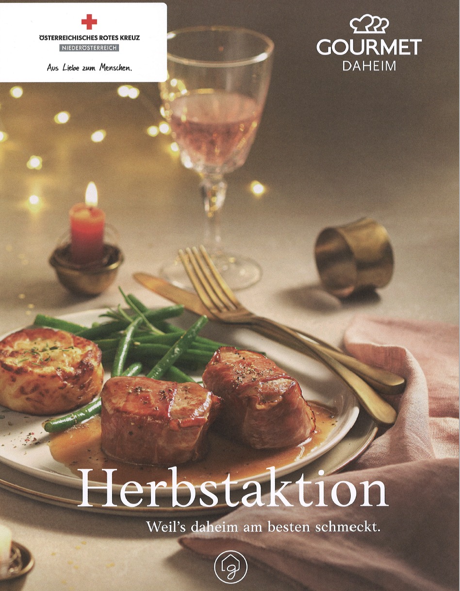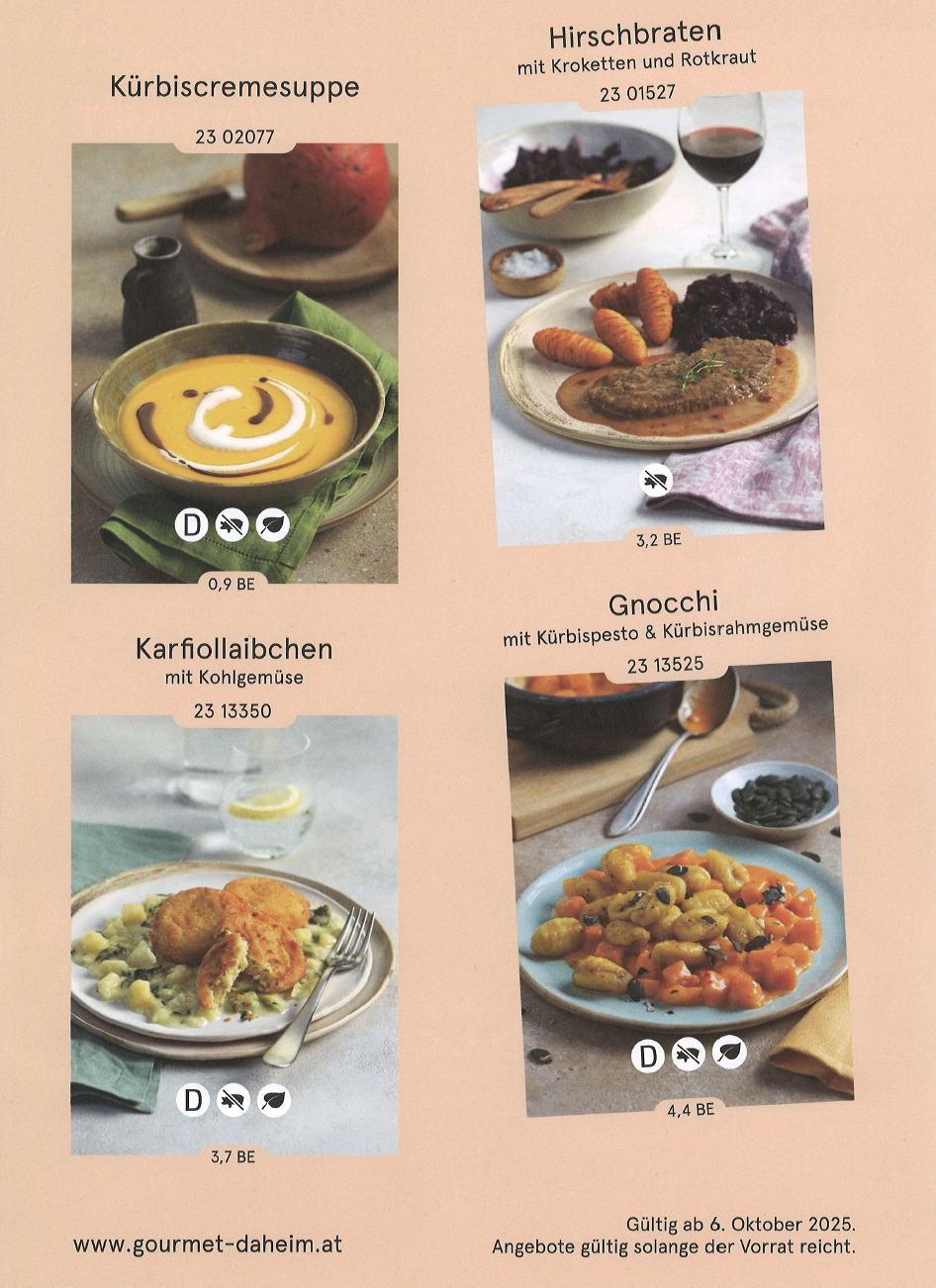 Gourmet zuhause liefert wieder abwechslungsreiche Speisen direkt nach Hause – von Kürbiscremesuppe über Hirschbraten bis zur Jubiläumsspeise Schweinsmedaillons im Speckmantel. Auch eine Jubiläumstorte wartet auf Sie.