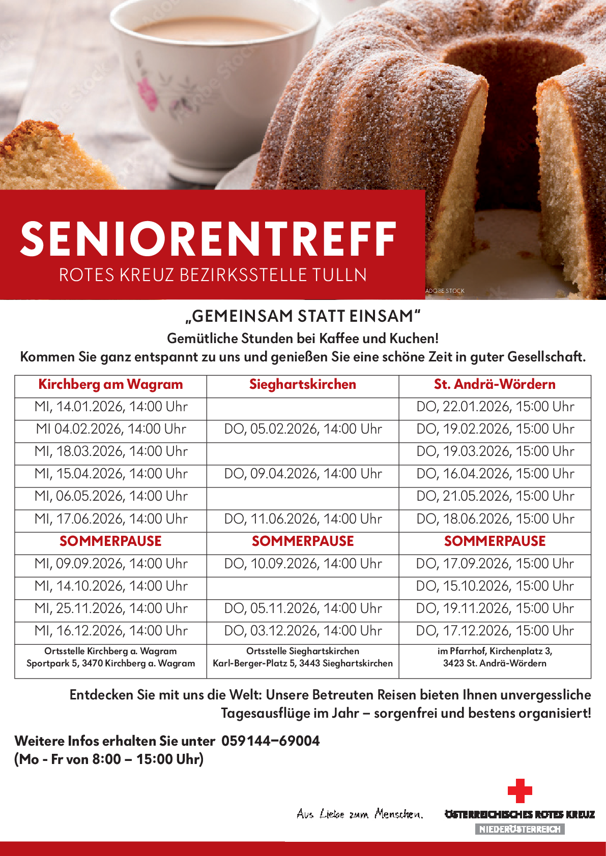 In regelmäßigen Abständen werden durch die Bezirksstellen des Roten Kreuzes Niederösterreich Seniorentreffs für unsere Gäste veranstaltet, die durch ein freiwilliges und fachkundiges Rotkreuz-Betreuerteam organisiert werden. In angenehmer Atmosphäre unter Gleichgesinnten wird bei Kaffee und Kuchen gespielt, gesungen, gebastelt und gefeiert. Das Programm bietet unseren Gästen je nach Jahreskreis Lustiges und Unterhaltsames.