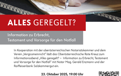 In Kooperation mit der oberösterreichischen Notariatskammer und dem Verein "Vergissmeinnicht" lädt das Oberösterreichische Rote Kreuz zum Informationsabend "Alles geregelt? - Information zu Erbrecht, Testament und Vorsorge für den Notfall" mit Notar Mag. Gerald Enzmann und der Raiffeisenbank Salzkammergut ein.