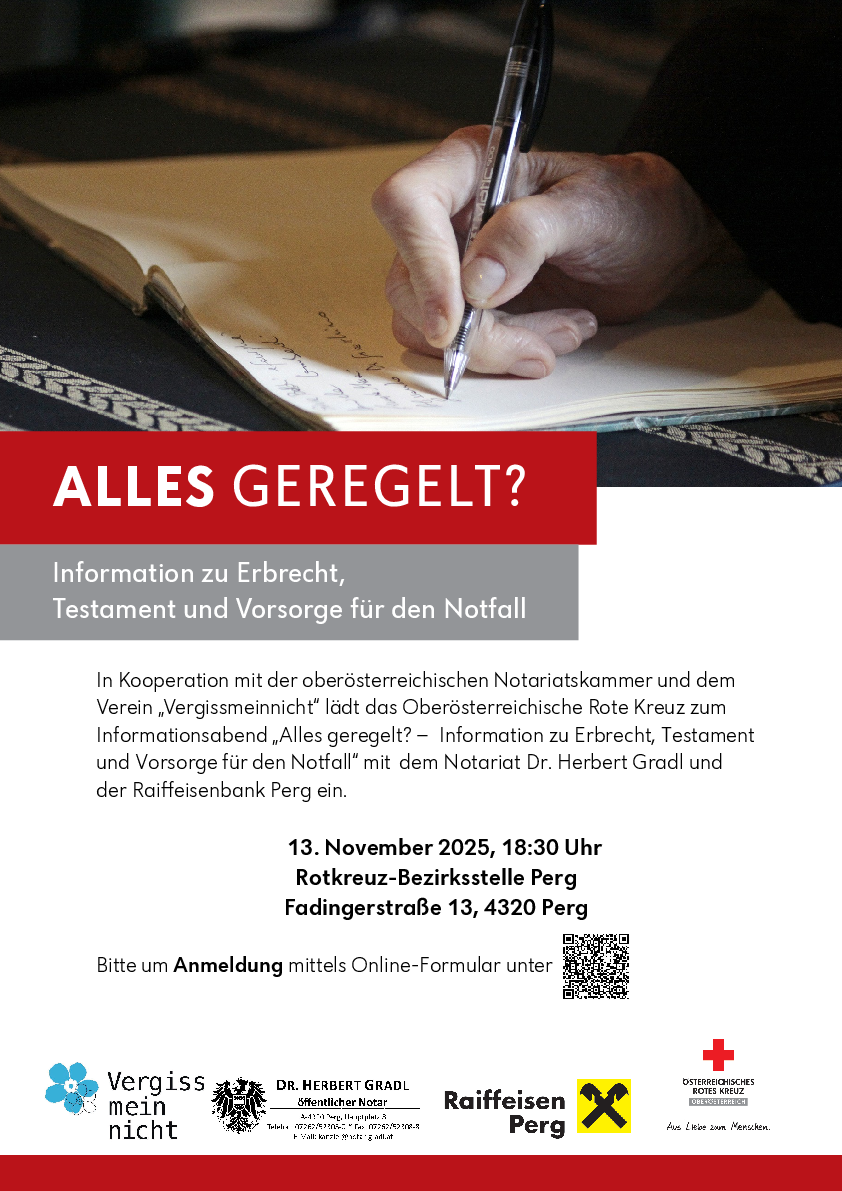 In Kooperation mit der oberösterreichischen Notariatskammer und dem Verein "Vergissmeinnicht" lädt das Oberösterreichische Rote Kreuz zum Informationsabend "Alles geregelt?" mit dem Notariat Dr. Herbert Grald und der Raiffeisenbank Perg ein.