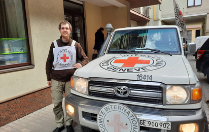 Ein Mitarbeiter des Ukrainischen Roten Kreuzes trägt ein Hilfspaket mit dem Schriftzug "ICRC"
