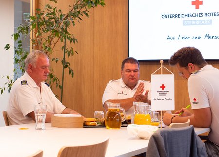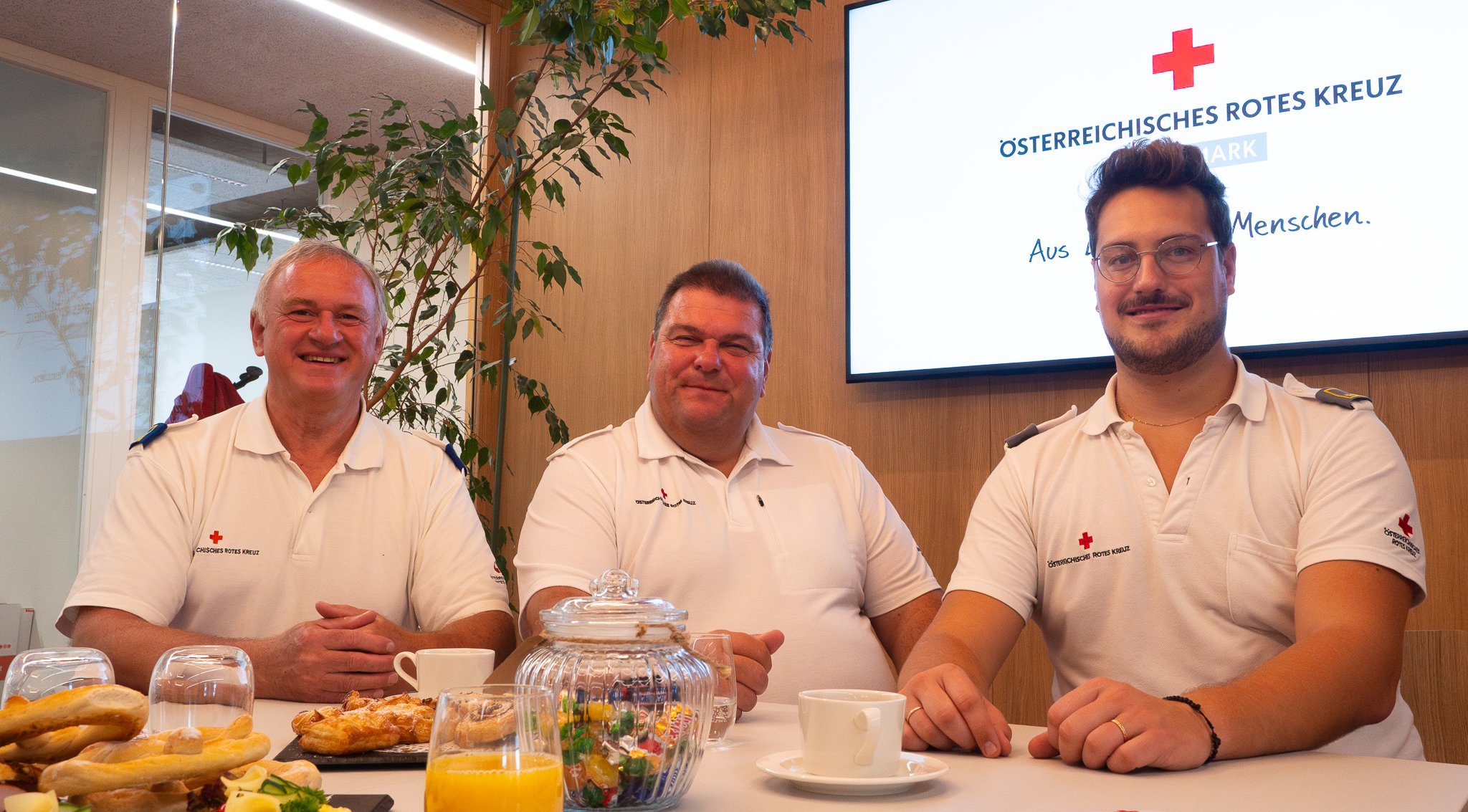 Stefan Loseries (rechts) von der Abteilungen Marketing und Kommunikation im Gespräch mit Vizepräsident und Landeskurat Michael Gruber (Mitte) sowie dem langjährigen ehemaligen Leiter des Jugendrotkreuzes, Johann Windisch (links), über Wallfahrt, Jugend und Seelsorge.