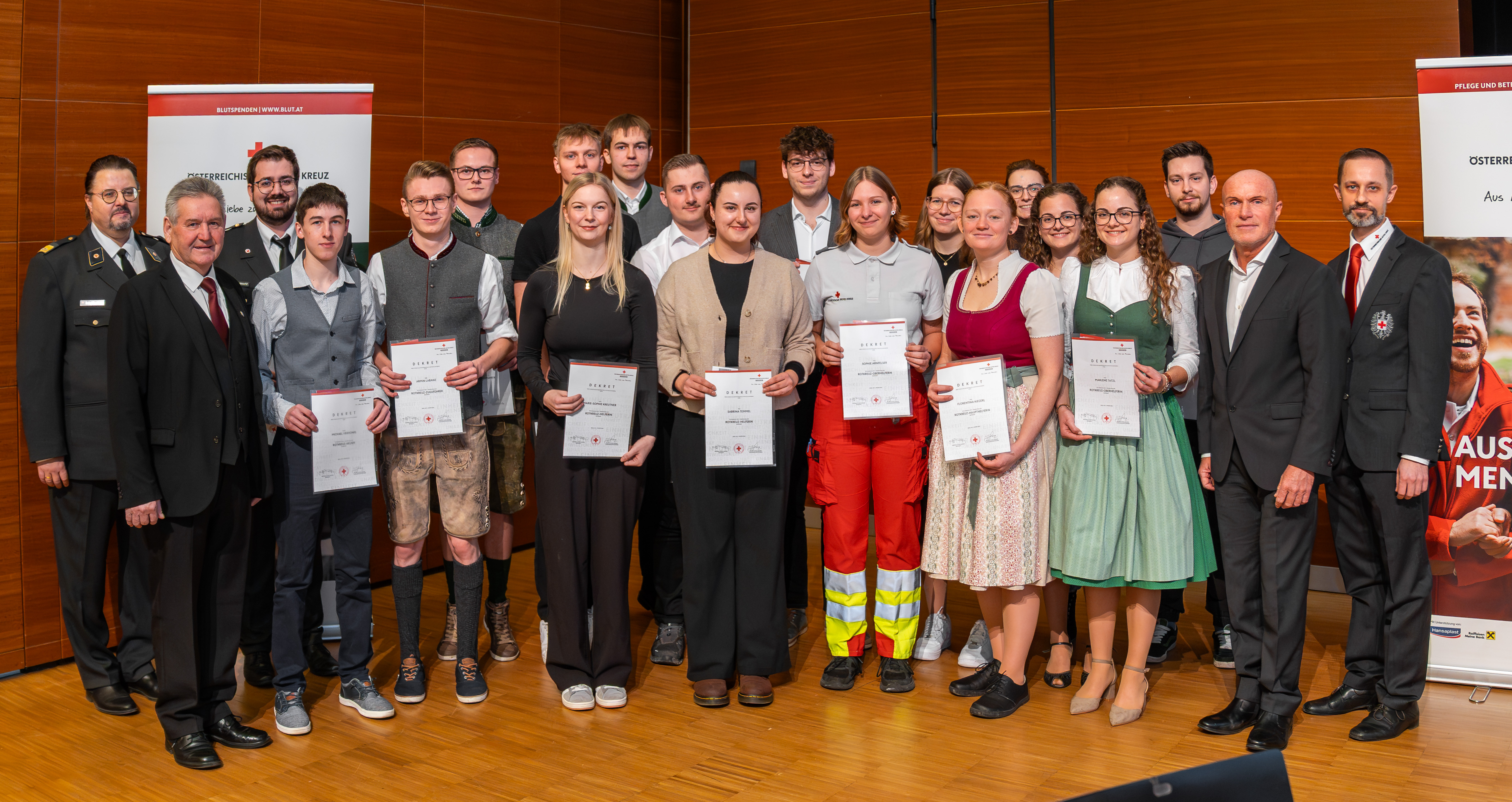 „Wir sind stolz darauf, im letzten Jahr 39 neue Rettungssanitäter/innen gewonnen zu haben.“ Einige davon waren anwesend und erhielten die Beförderung zum Helfer: Manuel Adam, Raphael Groß, Thomas Hutter, Marie-Sophie Kreutner, Tobias Patterer, Sabrina Temmel, Jakob Theußl und Michael Verhonig. Befördert wurden zum Oberhelfer: Sophie Arnfelser, Katja Hartinger, Katharina Lang, Sandra Strohmeyer, Carina Tatzl und Marlene Tatzl. Zum Haupthelfer wurde Florentina Kiegerl befördert. Nach Absolvierung der Führungskräfteausbildung FK1 wurden zum Zugsführer befördert: Stefan Plasonik, Simon Schmautz und Armin Labanz.