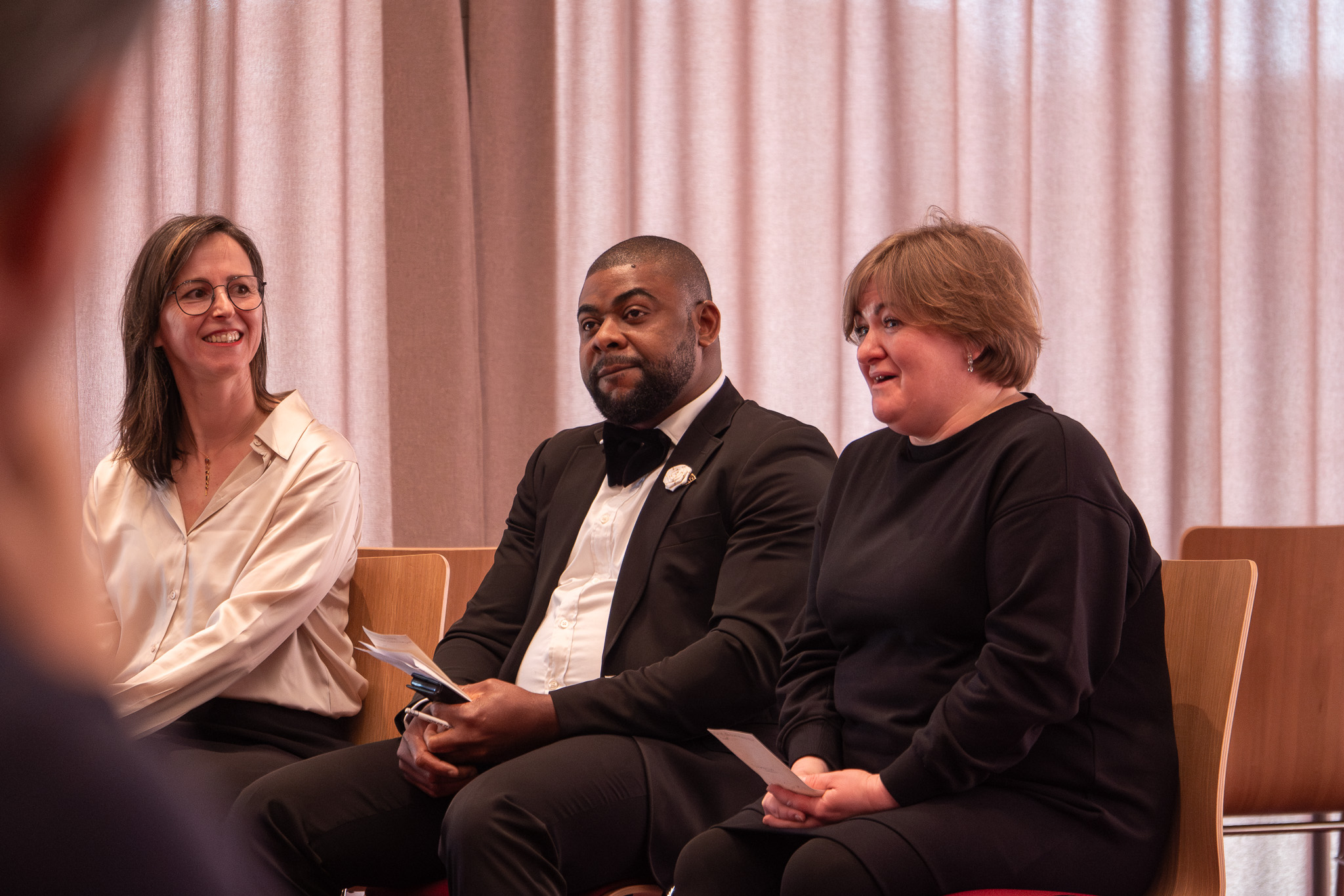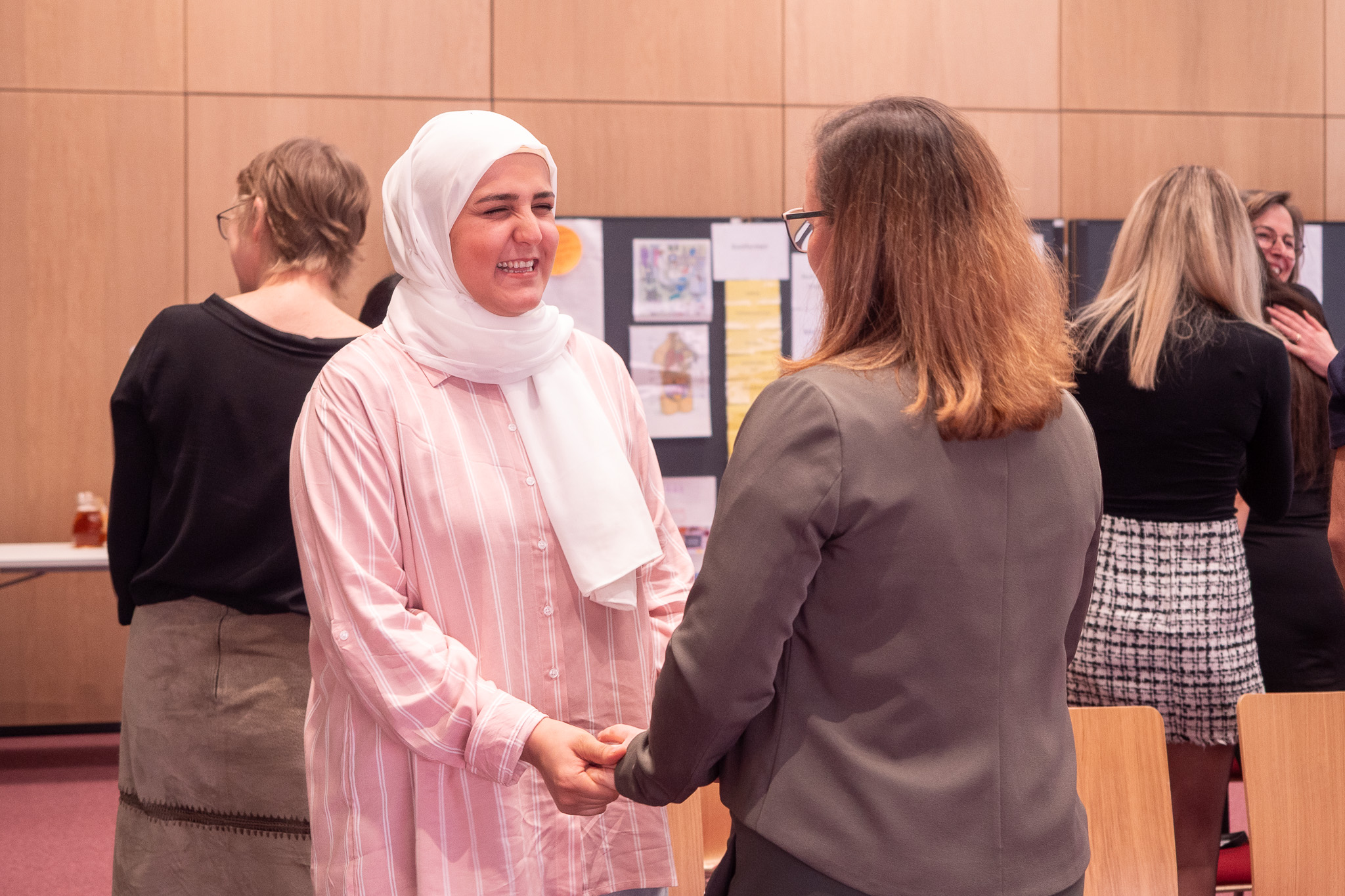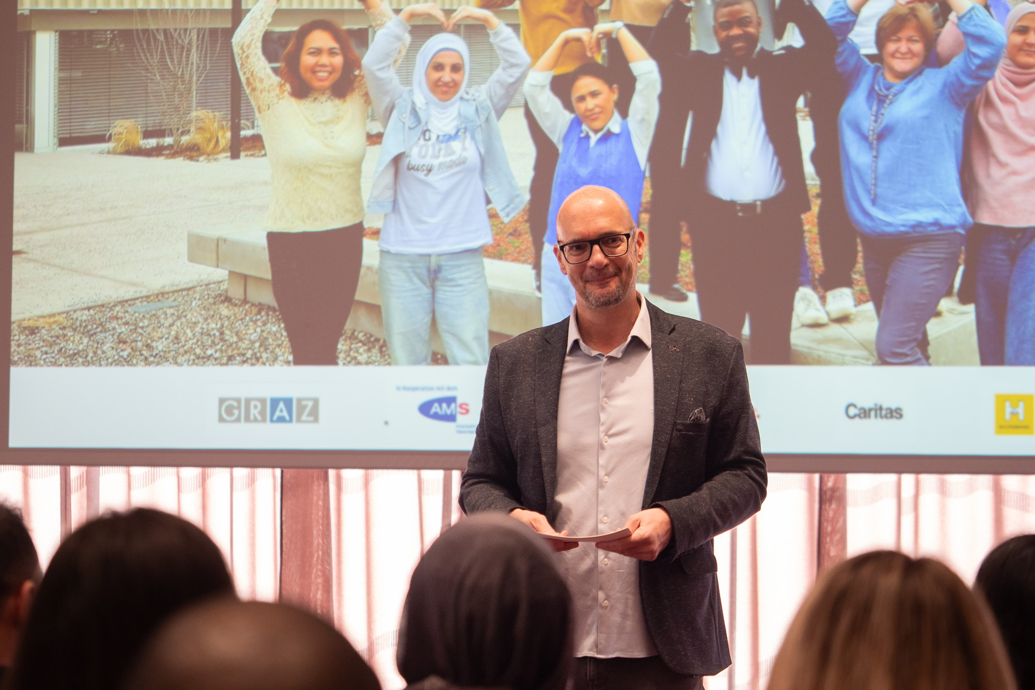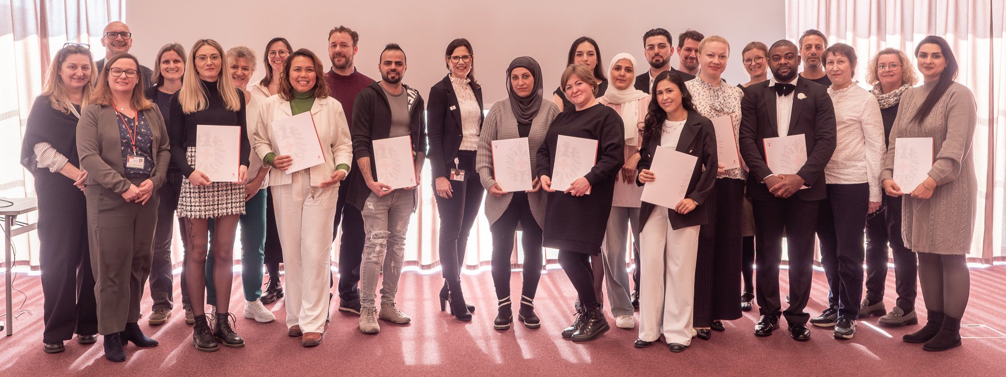 Im Rahmen einer würdigen Veranstaltung wurden heute in der Rotkreuz-Landeszentrale die Zertifikate an die Absolvent:innen des aktuellen migrants care-Kurses überreicht. Nach der Eröffnung und einem Rückblick auf die Entstehung und Entwicklung des Projekts durch den Projektverantwortlichen Bernhard Strobl wurden die Leistungen der Teilnehmer:innen gewürdigt und die Zertifikate feierlich übergeben. Unter den anwesenden Gästen befanden sich Vertreter:innen aus Politik und Partner-Organisationen, darunter Silke Jungbauer als Landesgeschäftsführer-Stellvertreterin des Roten Kreuzes, Büroleiter Christopher Fröch in Vertretung von Stadtrat Mag. Robert Krotzer, Margarete Peszl (AMS Regionale Geschäftsstelle, Kursbetreuung) sowie Stefan Hammer-Maier von der zentralen Praktikumskoordination der Geriatrischen Gesundheitszentren der Stadt Graz. Ebenso durften Marie Theiler vom Kooperationspartner „Wegweiser Pflegewelt“ sowie zahlreiche interne Gäste begrüßt werden.