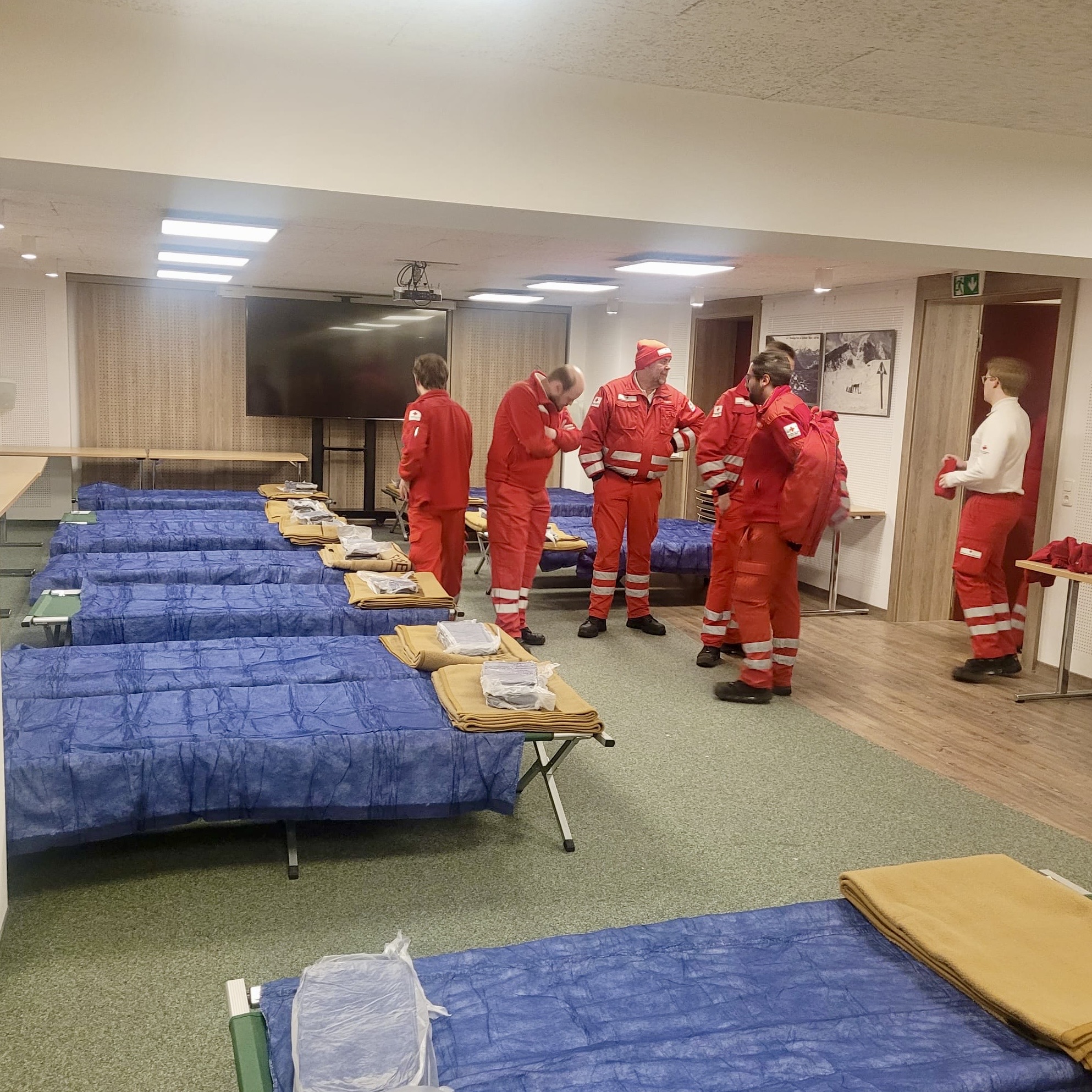 Innerhalb kürzester Zeit rückten elf ehrenamtliche SEG-Mitglieder ein. Die Einsatzkräfte bereiteten Feldbetten, Decken, Schlafsets und Hygieneartikel vor und transportierten die Ausstattung nach Berwang. Dort wurde im Gemeindesaal ein provisorischer Schlafsaal eingerichtet. Vor Ort wurde zudem Tee zubereitet, damit sich die Kinder nach dem Erlebnis aufwärmen konnten. Dank der eingespielten Abläufe und der professionellen Vorbereitung konnte die Unterkunft rasch aufgebaut und betriebsbereit gemacht werden.