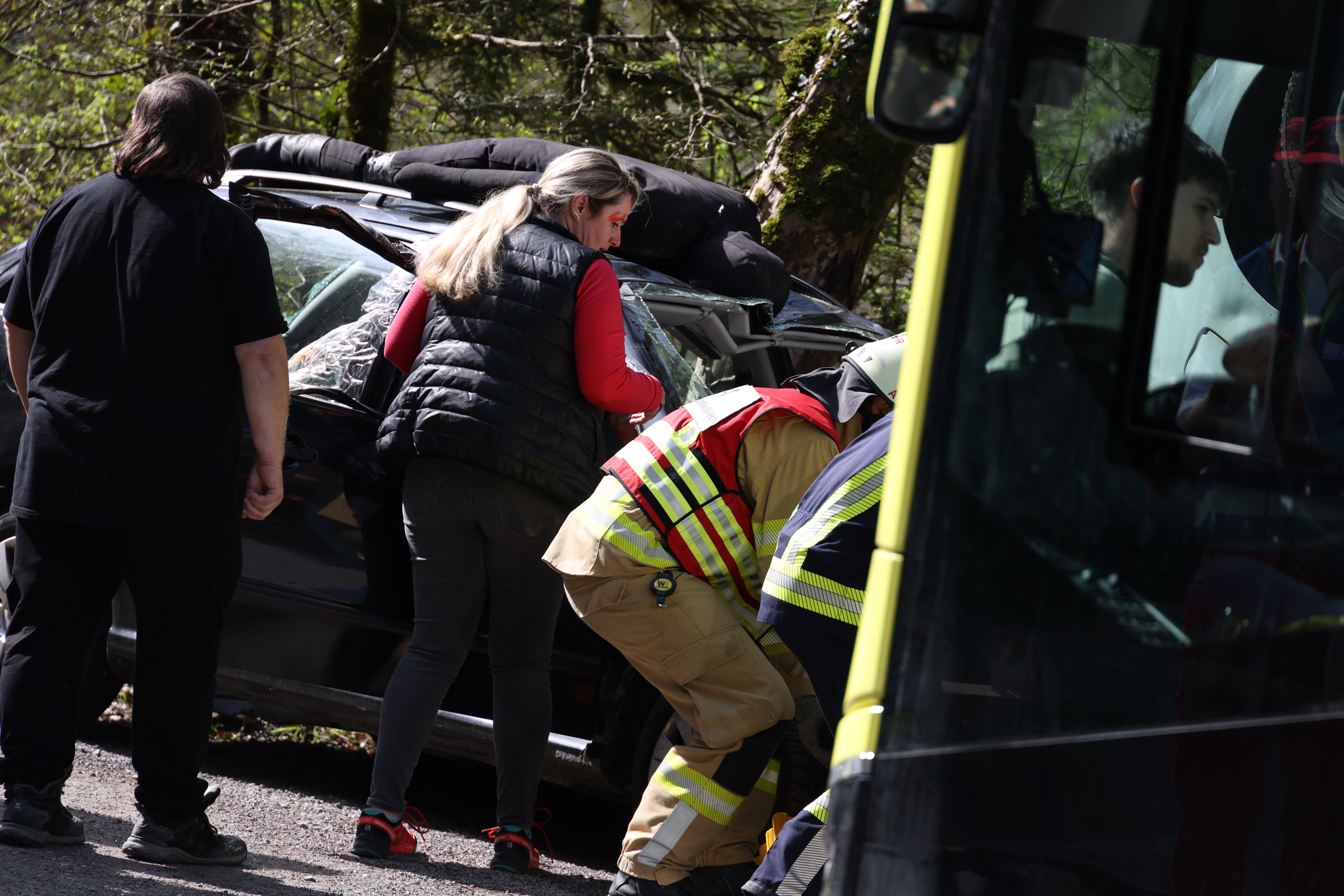 Durch die enorme Wucht des Aufpralls überschlägt sich der Pkw mehrfach und kommt schließlich am Waldrand auf dem Dach zum Liegen. Der Fahrer wird eingeklemmt, ein weiterer Insasse auf der Rückbank eingeschlossen. Zwei weitere Fahrzeuginsassen werden aus dem Fahrzeug geschleudert und bleiben schwer verletzt im steilen Gelände sowie teilweise im Wasser liegen.