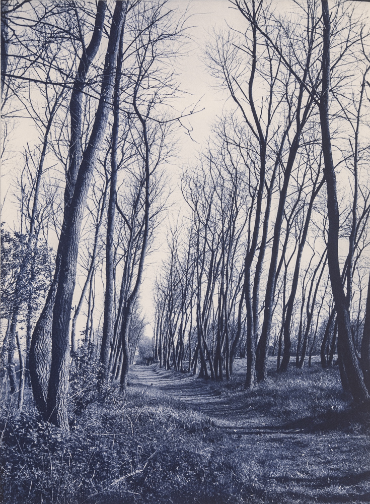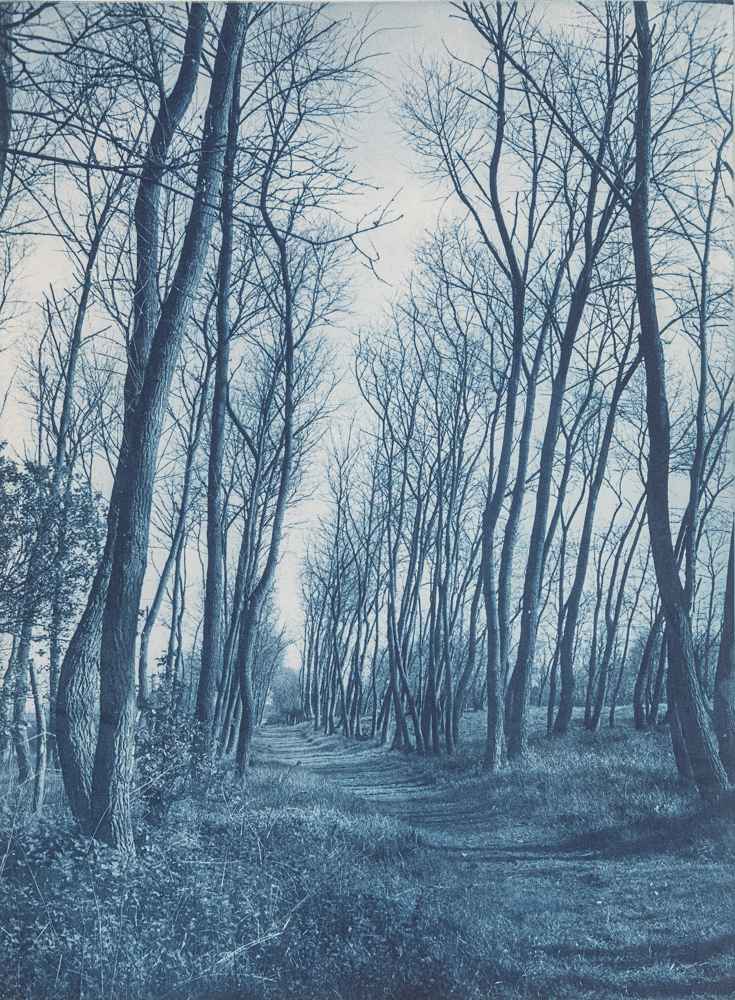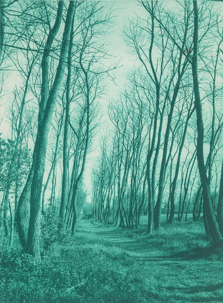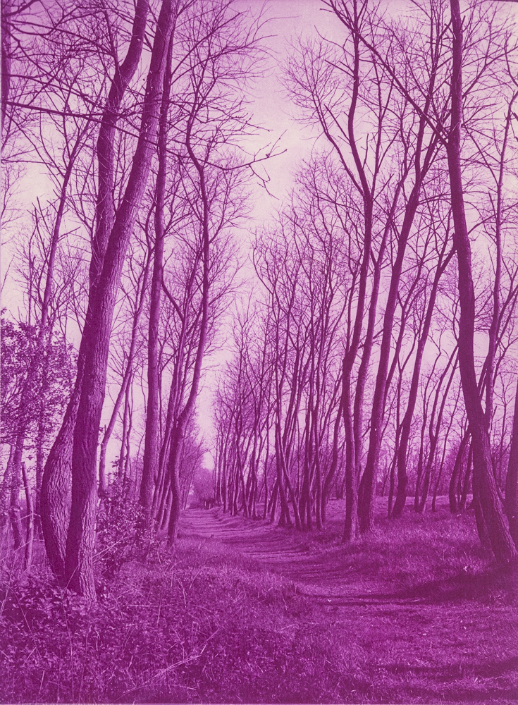 Die Edition "Weg-Blicke" lädt zu einem meditativen Spaziergang in Belgiens Wälder ein: Hinter den Dünen wurzeln schlanke, aber starke Bäume in einer dünnen Erdschicht. Als VALIE EXPORT in den 70er-Jahren durch diese Waldstücke spazierte, war sie fasziniert von den Wegen und Blicken, die sich zwischen den Bäumen eröffneten. Diese "Weg-Blicke" hielt VALIE EXPORT damals als Fotografie fest. In der vorliegenden Edition wurde von der Fotografie eine Fotogravüre erstellt. Diese frühe und fast schon nostalgische Technik der Fotografiereproduktion lässt echte Halbtöne zu. Das Motiv wurde zuerst schwarz abgedruckt,wobei mit verschiedenen Intensitäten experimentiert wurde. Als zweite Schicht wurde dieselbe Platte in kräftigen, bunten Farben monochrom abgedruckt. Entstanden sind Blätter, die in vielfältigen und kräftigen Farben erstrahlen. Dabei soll eine Parallele zu einer Plakatserie des Motivs der "Aktionshose" enstehen: Das Motiv wurde damals auch in unterschiedlichen Farben einfarbig überdruckt.